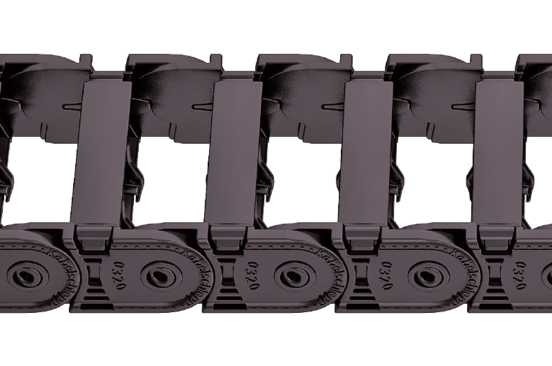 The QT0320 meets these requirements thanks to its innovative design and material combination of a hard cable carrier body made from glass fiber-reinforced material and crossbars with a film hinge made from rigid special plastic.